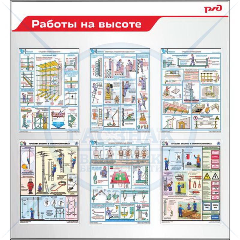 Стенд Работы на высоте, Логотип (1100х1200; Пластик ПВХ 4 мм; Алюминиевый профиль), Комплект - Безопасность работ на высоте – А3х3-1шт, Средства защиты в электроустановках – А3 Плакат №3-1шт, Предохранительные пояса строительные – А3 Плакат №1-1шт, Средс