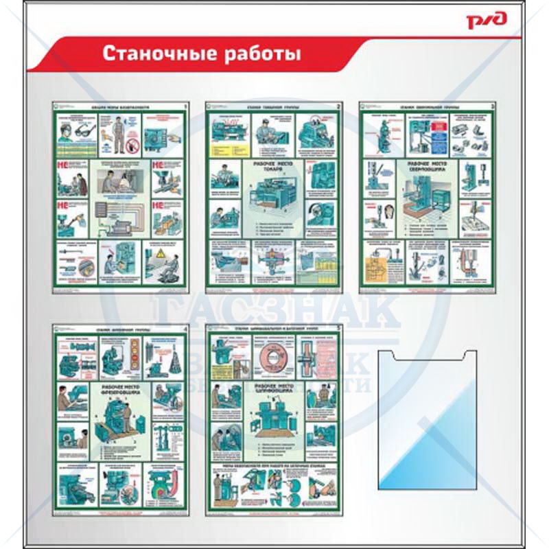 Стенд по технике безопасности Работы на станках РЖД 5 плакатов А3, карман А3 (1100х1100; Пластик ПВХ 4 мм, алюминиевый профиль; )