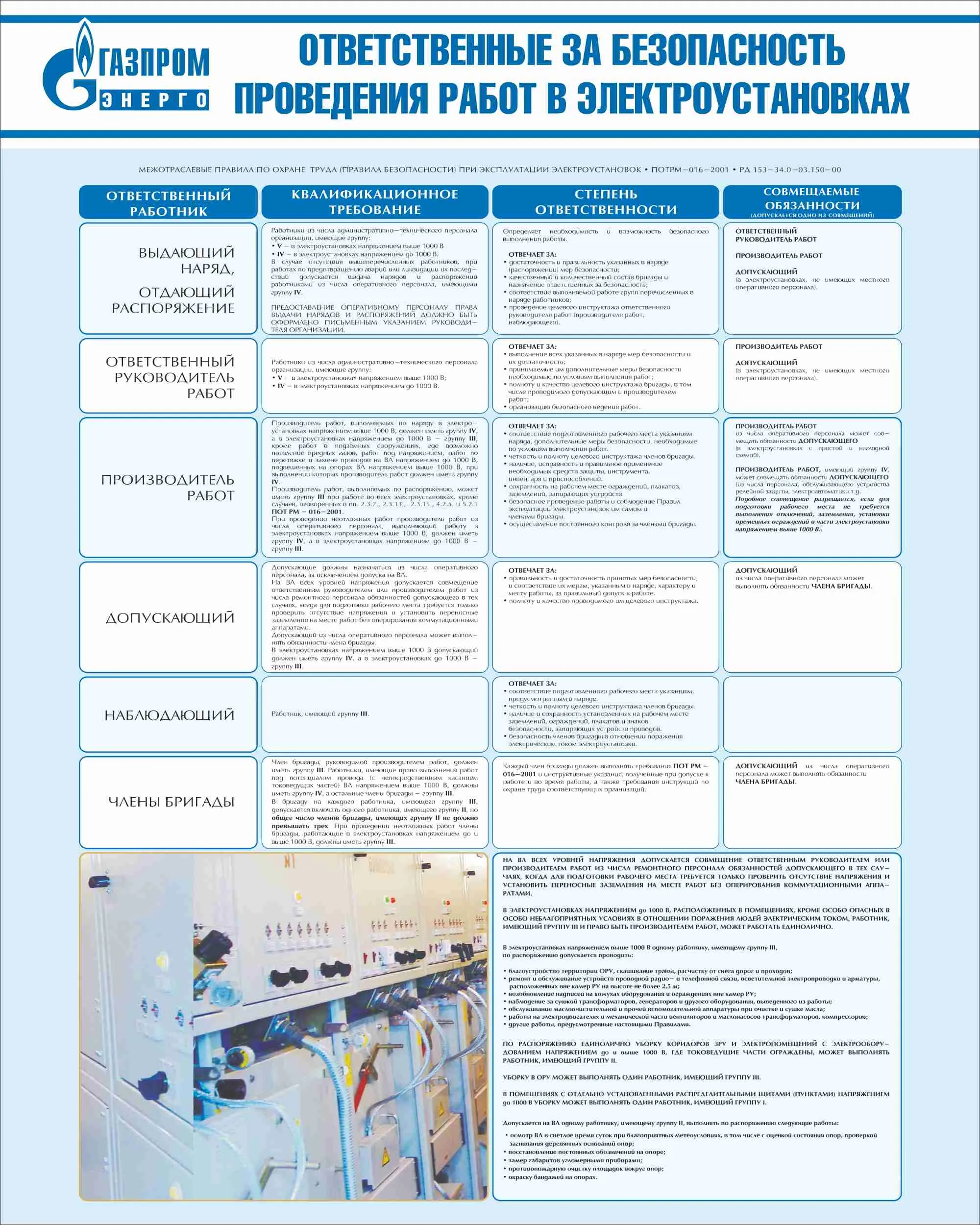 Стенд Ответственные за безопасность проведения работ в электроустановках, плакат, логотип, голубой фон. (800х1 000; Пластик ПВХ 4 мм; Алюминиевый профиль)