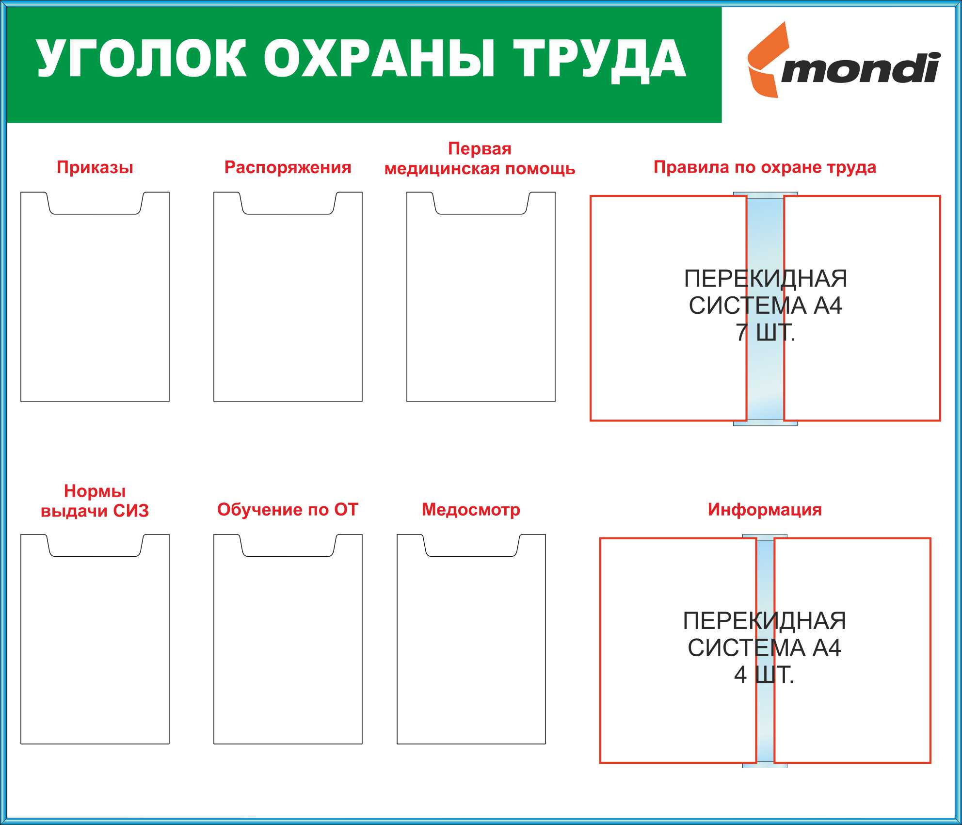 Стенд Уголок охраны труда, 6 карманов А4 (плоские), перкидное устройство на 7 рамок, перкидное устройство на 4 рамки, Логотип (1400х1200; Пластик ПВХ 4 мм; Пластиковый белый)