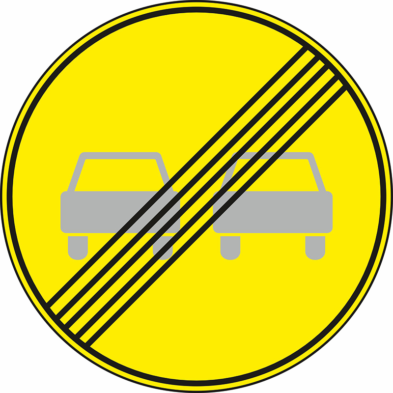 «Конец запрещения обгона» используют для отмены запрета, введенного ранее знаком «Обгон запрещен», во время проведения ремонтных работ на дороге и в других подобных случаях. С того участка, где установлен временный знак, снимающий ограничение, транспорту разрешается опережать одно или несколько транспортных средств. Табличку применяют в случаях, когда область с запрещенным обгоном нет необходимости продолжать до перекрестка или границы населенного пункта. На одно-, двух- или трехполосной дороге для движения изображение в обоих направлениях может находиться только слева и размещаться на обороте знака, запрещающего обгон.