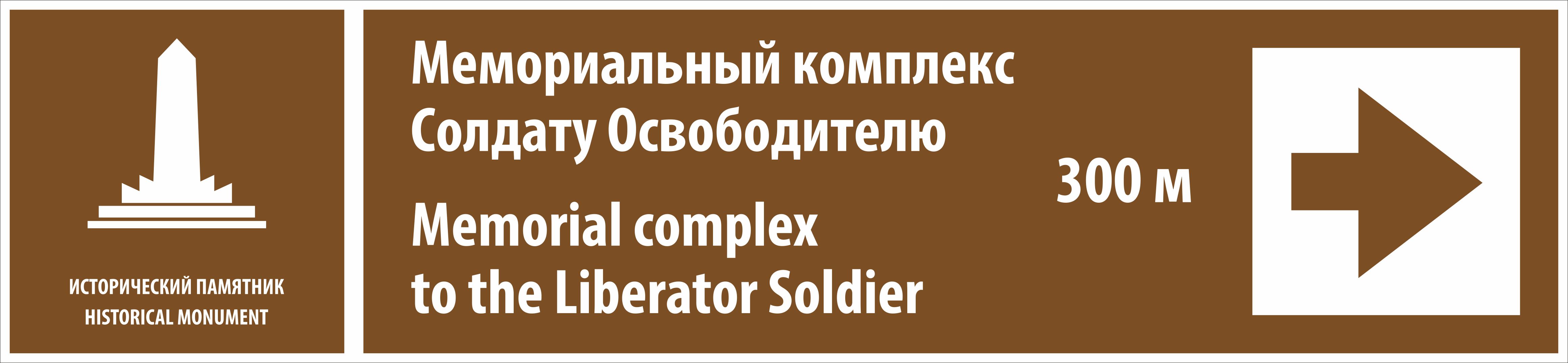 Указатель направления "Мемориальный комплекс Солдату Освободителю, 300 м" входит в группу знаков туристической навигации. Используется для указания направления к туристическому объекту, чтобы помочь туристам ориентироваться на незнакомой местности.